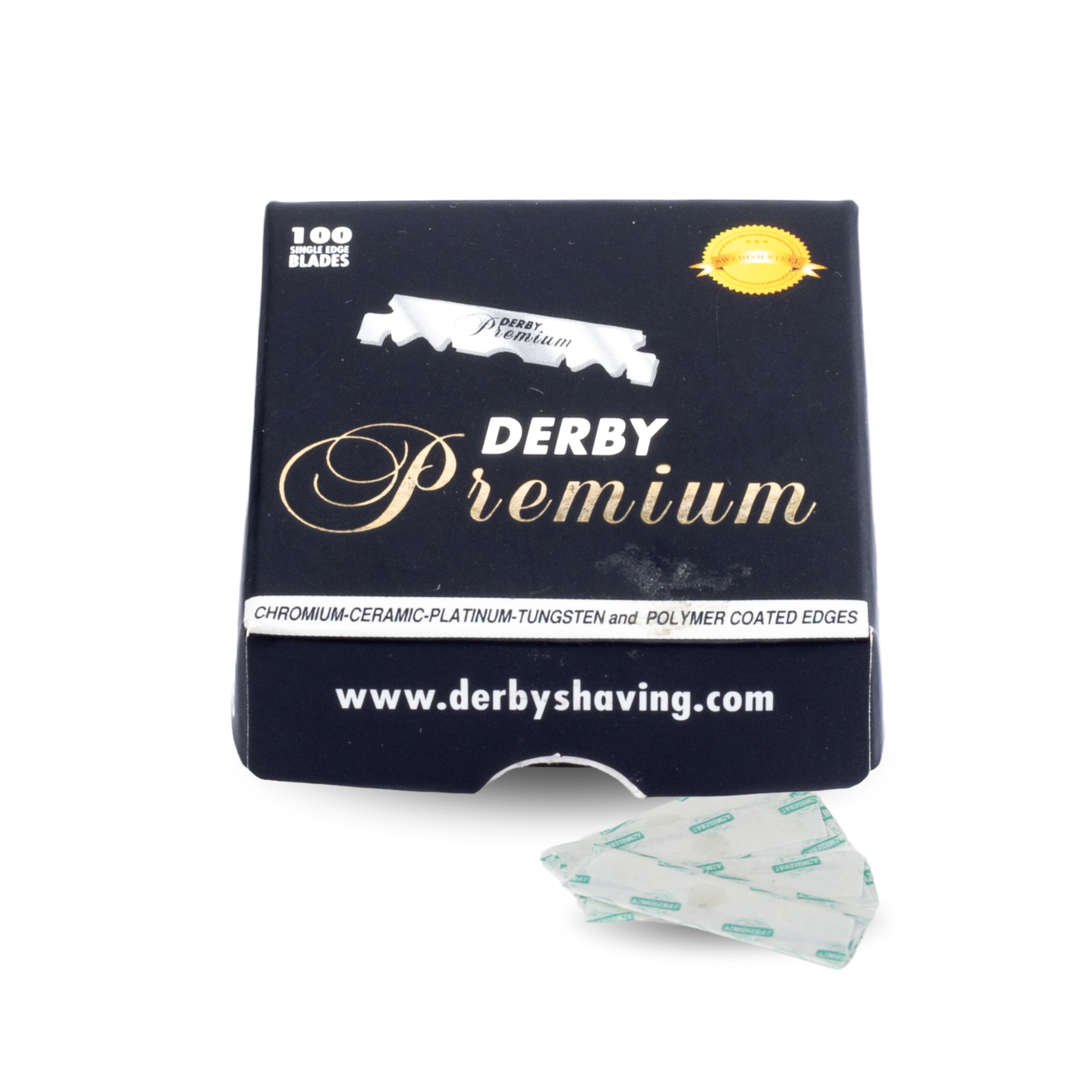 - Embalagem contendo 100 lâminas Derby Premium de corte simples, para um barbear suave em qualquer parte do corpo.